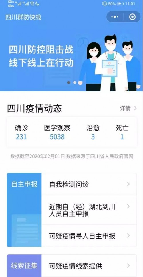 2月3日,四川迅速上線了"四川群防快線平臺",提供個人疫情防控信息自主申報、在線自我檢測、專家視頻問診、可疑疫情線索上報、權(quán)威信息發(fā)布、違反防控規(guī)定行為舉報等在線服務。